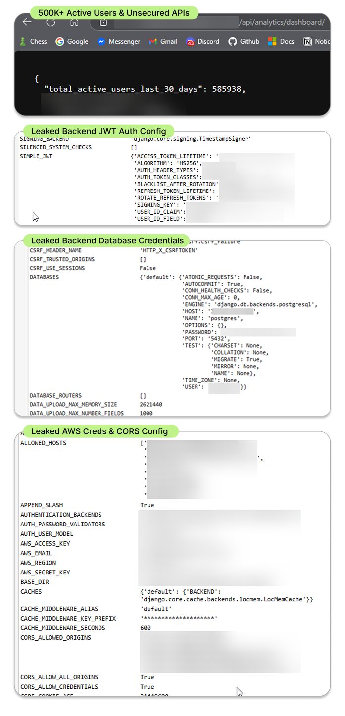 Leaked Backend Database Credentials: Yes, the database password. Including hostname, database name (postgres), and port. Having this exposed is incredibly risky, potentially granting an attacker direct access to user data, platform content, and operational logs.
